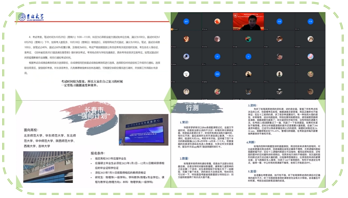 分享嘉宾李子越,声学专业,通过了吉林省定向选调生的选拔。李子越从报考条件、信息匹配、笔试准备、面试准备、面试经验等方面展开分享,他强调上岸的秘诀就是勤学多练、不走捷径、相信自己!