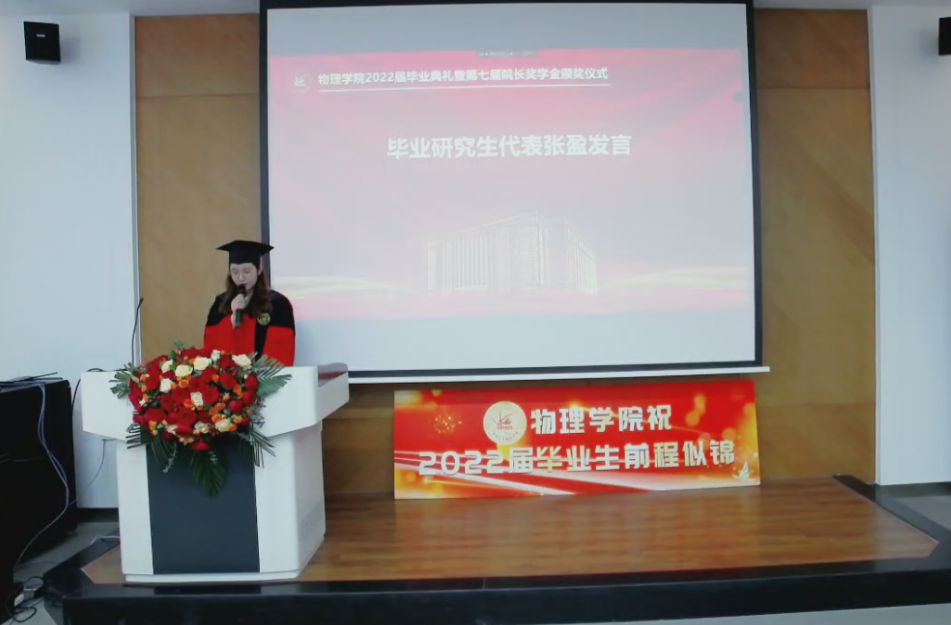 2022届毕业研究生代表张盈发言。回顾自身的学习经历,在科研这一场持久战上,她喜欢做科研时纯粹而又踏实的感觉,未来也将继续在科研的道路上走下去。最后,真诚地感谢老师们在一路上给予的鼓励、支持和引导,并向公司和老师献上真挚的祝福。